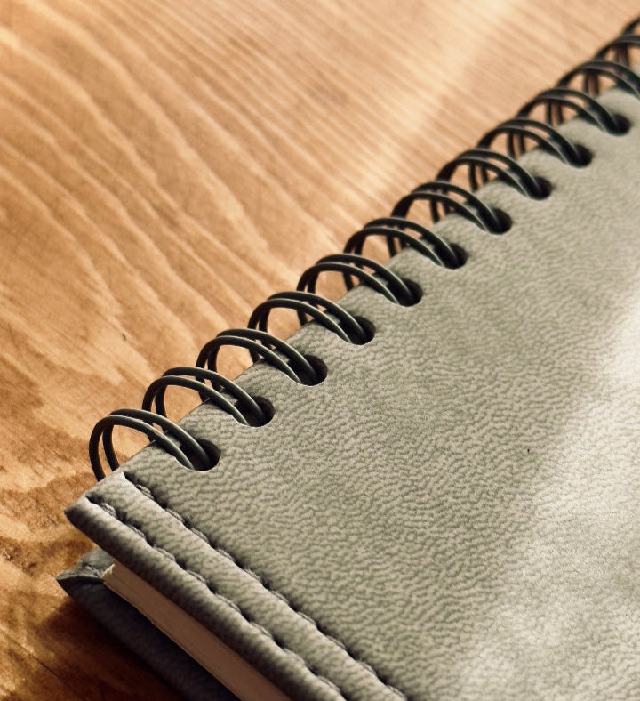 ولكن، من الناحية العملية، يعلم الجميع مدى الإحباط الذي نشعر به عند محاولة الكتابة على مثل هذا الدفتر. خاصة حين نريد الكتابة على الجانب قليل الاوراق. لذلك، أردتُ اعتماد تقنية تجميع حلزونية (سبيرال) دون المساس بالجماليات.